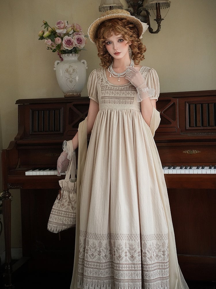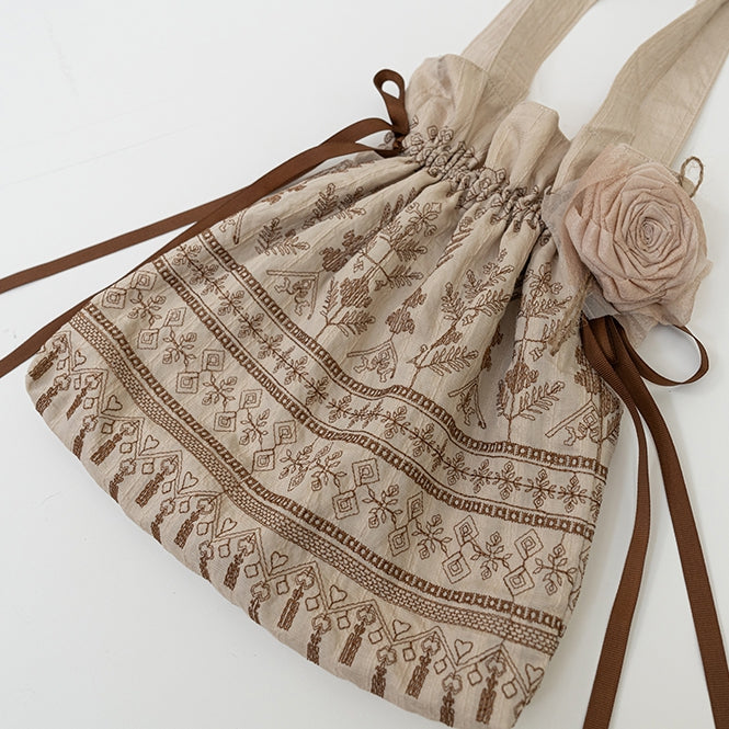 Brown / Blue Vintage Embroidery Handbag with Floral Brooch