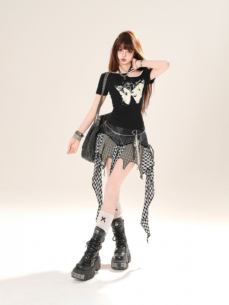 Embrace the charm of whimsical elegance with this Butterfly Print Round Neck Cutout Detail T-Shirt. This piece beautifully marries style and comfort, featuring a classic round neckline with playful cutout details that add a touch of intrigue. The enchanting butterfly print captures the essence of nature's beauty, making it a perfect choice for those who appreciate a blend of kawaii and casual fashion.