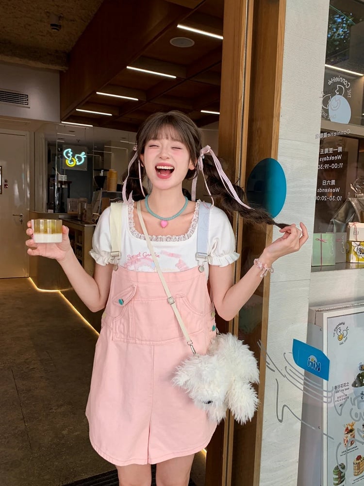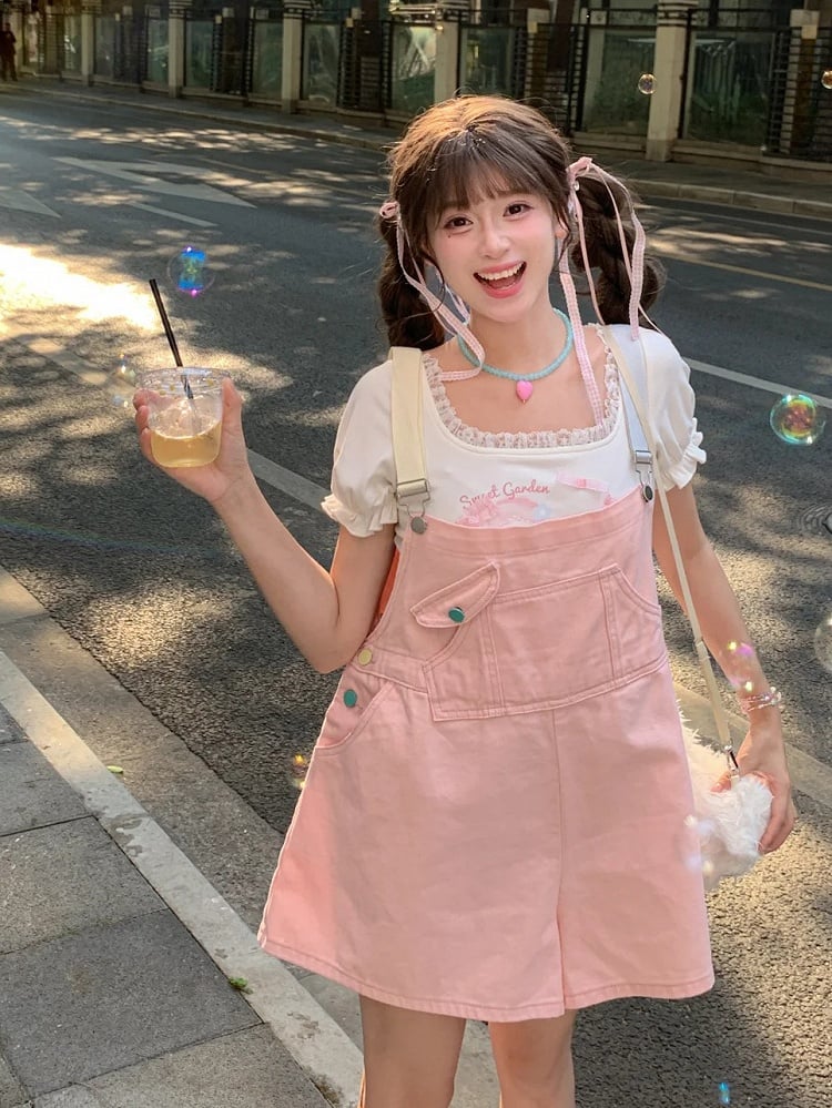 Candy Color Pink/Mint Green Denim Overall Shorts