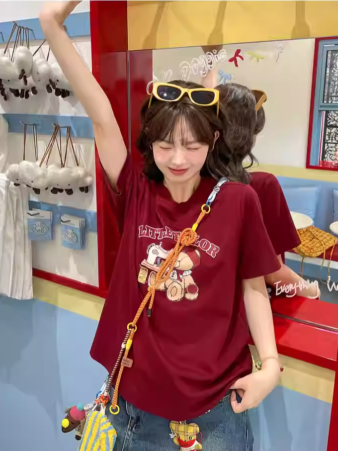 Embrace a playful yet stylish look with our wine red t-shirt, featuring an adorable cartoon bear print. This tee effortlessly blends comfort with a touch of whimsy, making it an ideal choice for casual outings or cozy days at home.