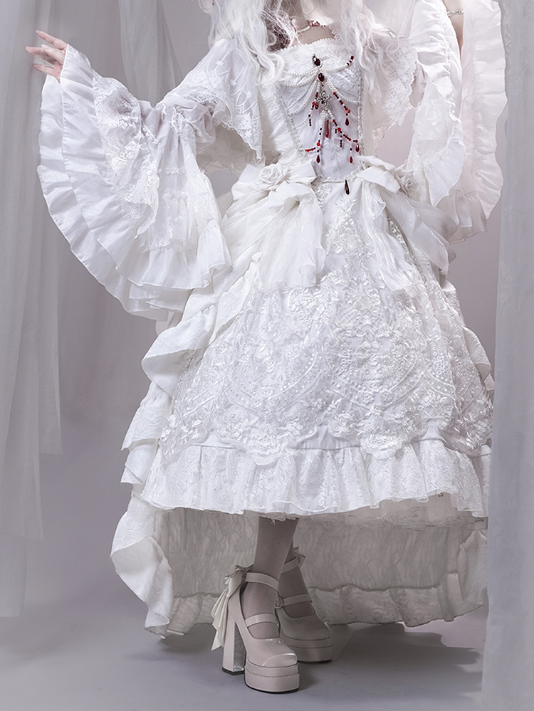 These Mary Jane shoes feature a rounded toe adorned with embroidered lily-of-the-valley flowers, adding a touch of delicate elegance. The custom lily-of-the-valley buckle further enhances their unique charm. The heels are also embellished with intricate lily-of-the-valley embroidery, while the back of the shoes is graced with a grand trailing bow, exuding opulence and sophistication.