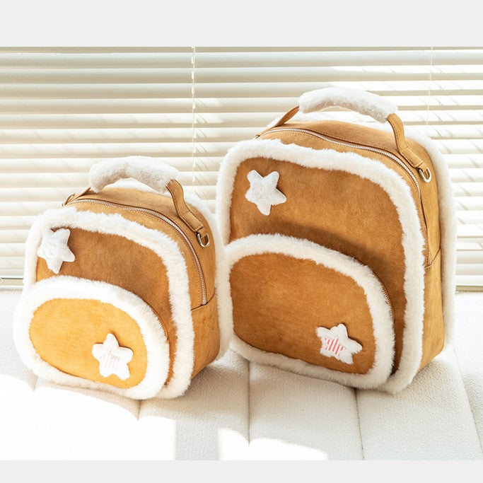 Chic 2-Way Small-Sized Brown Backpack With Plush Trim And Fuzzy Star Accents