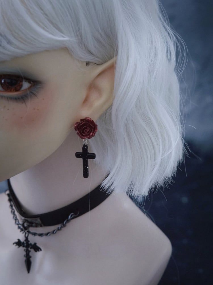 Clearance-Red and Black Handmade Roses With Cross Charm Earrings