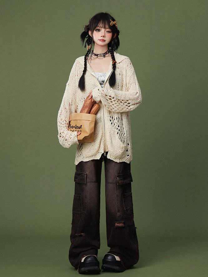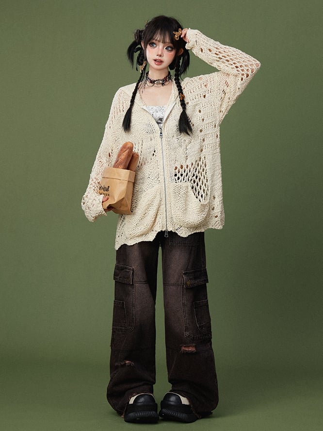 ● Button Closure and Zip Fly / Distressed Design / Distressed Holes / Raw and Frayed Cuffs / Slant Front Pockets / Wide-leg Cut