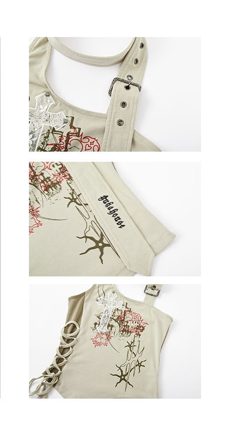 Step into a world of nostalgic charm with our Y2K-inspired halter neck top. This captivating piece features a unique buckle design that is fully adjustable, ensuring a perfect fit for any adventure. The front is adorned with an intricate lace cross applique, adding a touch of elegance and allure. A vibrant print design enhances its playful and bold aesthetic, making it a standout choice for any wardrobe. The side lace-up detail not only provides a customizable fit but also adds an edgy twist to this already stunning top.