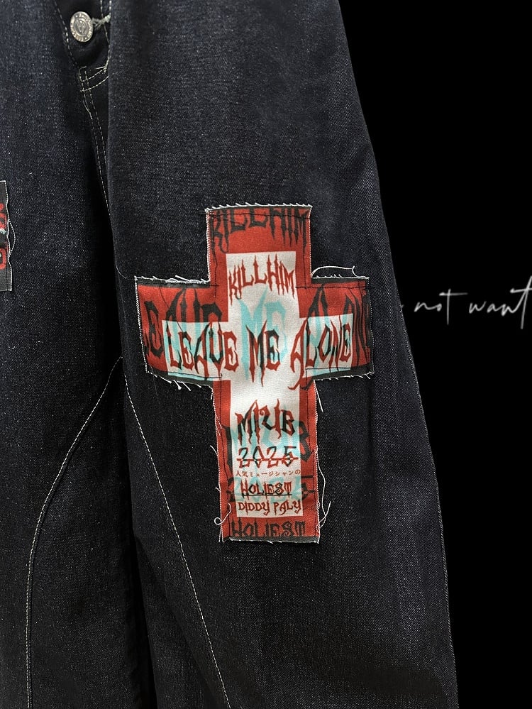 Elevate your casual wardrobe with these stylish wide-leg jeans, featuring intricate cross appliques that add a touch of edgy flair. The rich dark blue hue offers a versatile and sophisticated look, perfect for pairing with your favorite tops and accessories.