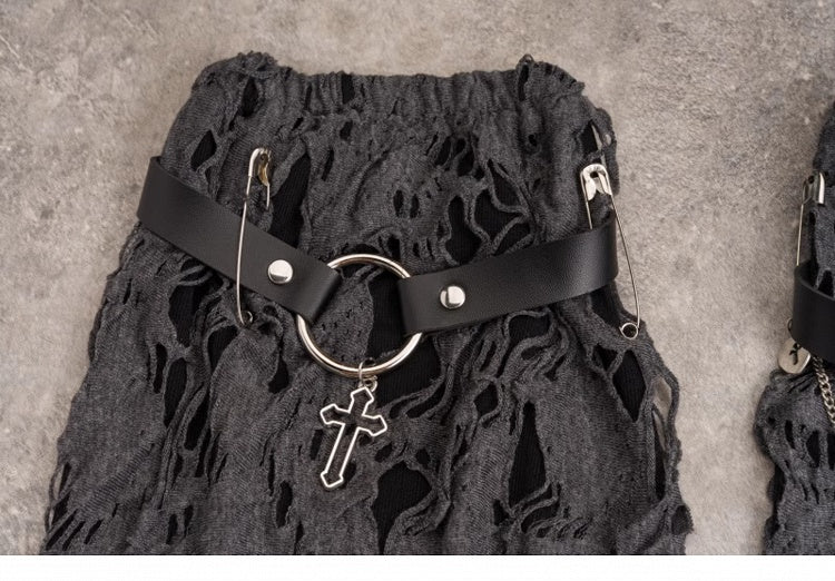 Cross Decorated Distressed Holes Dark Gray Gothic Leg Warmers
