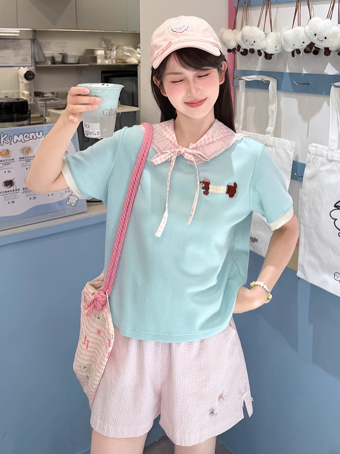 Cute Dachshund Embroidery Mint Green Round Neck T-shirt