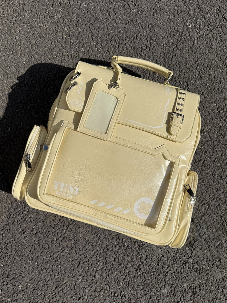 Crafted from PU leather, this versatile bag features adjustable straps for handheld or backpack use and a card holder charm. Its clear window layer is decorated with cat ears, and the flap is accentuated with two decorative silver rings.