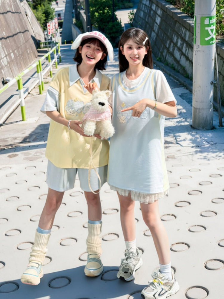 Cute Puppy Embroidery Apricot/Blue Colorblock Design Loose T-shirt Faux Two-pieces