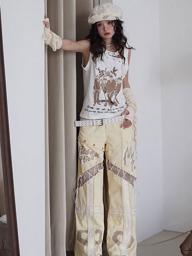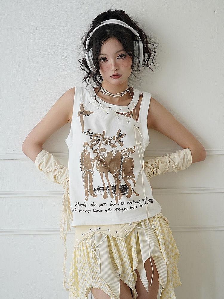 Elevate your summer wardrobe with our cutout detail white tank top. This charming top features a delicate lace-up detail and a beautiful print design. Perfect for sunny days, this top is designed to keep you cool and stylish.