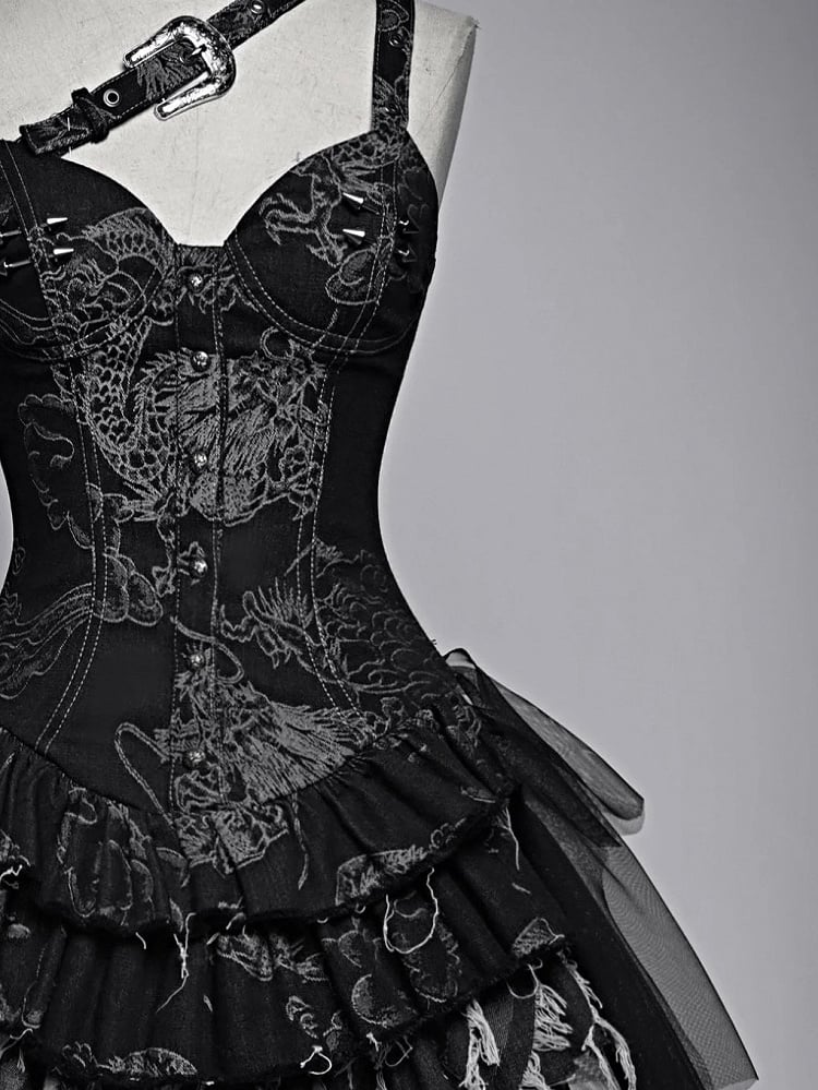 Dargon Pattern Black Denim Corset Dress with Detachable Tulle Hem Summer Punk Festival Dress