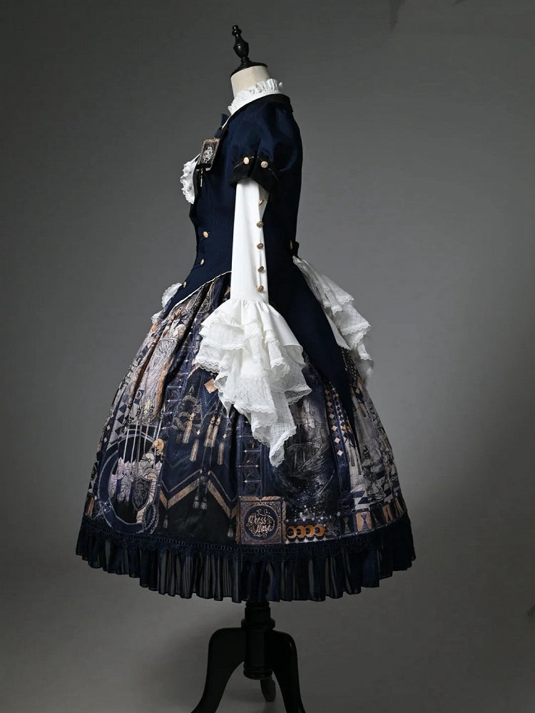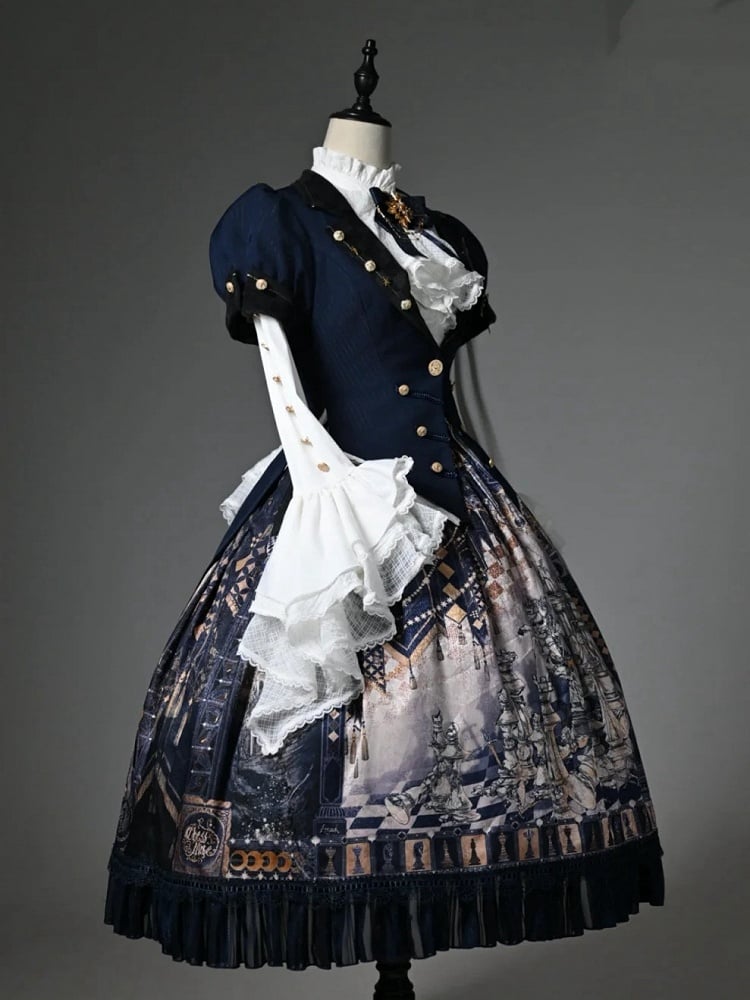 Dark Blue Blazer Collar Short Puff Sleeves Split-Tail Top