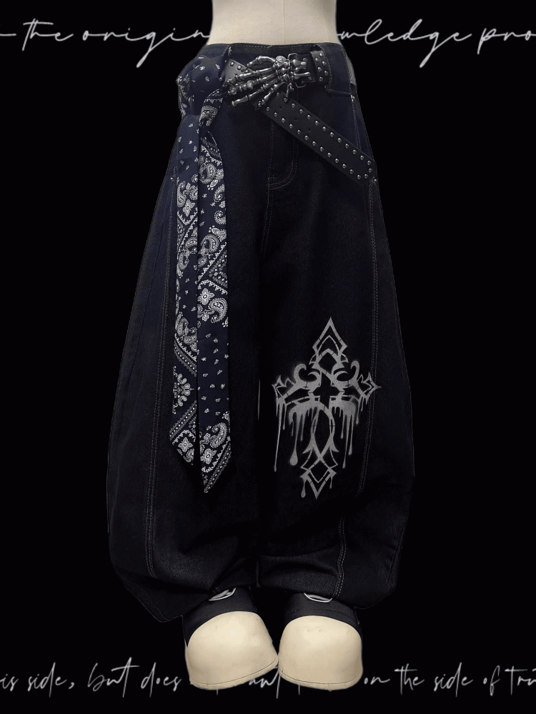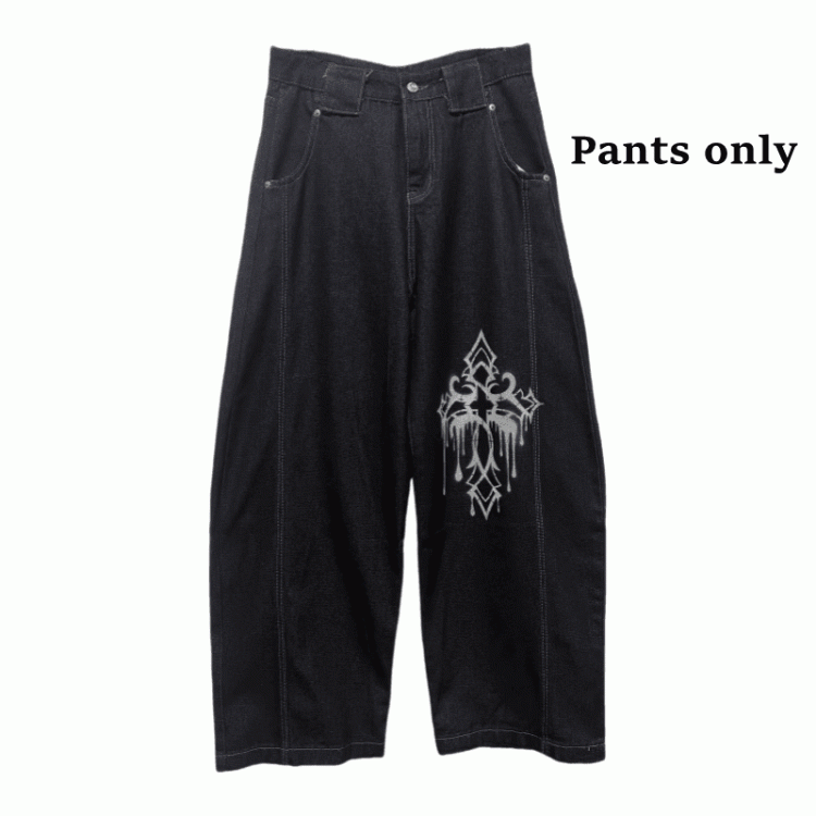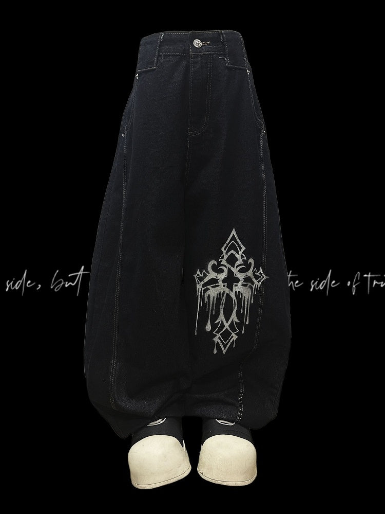 Embrace a bold fusion of gothic and street style with these dark blue wide-leg jeans, featuring an eye-catching cross print. Perfect for making a statement, these jeans combine comfort with edgy fashion, offering a versatile addition to your wardrobe. The wide-leg cut provides a relaxed fit, ideal for pairing with your favorite tops and accessories for a unique, standout look.