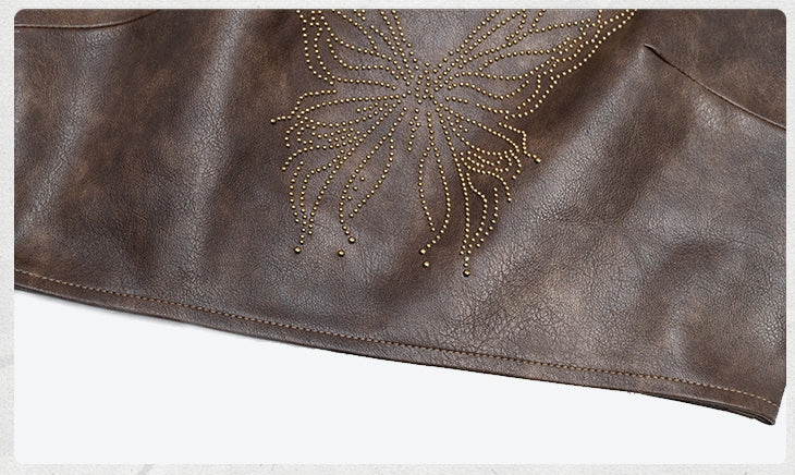 This edgy top features a unique combination of dark brown PU fabric and lace paneling, giving it a distinctive wasteland punk vibe. The halter neck style adds a touch of allure, while the butterfly design adds a hint of sparkle.