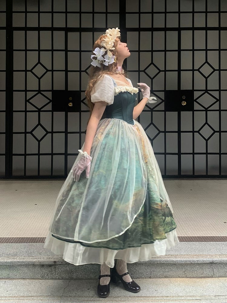 This dress is inspired by the eponymous oil painting "Morning in the Pine Grove" by Russian painter Shishkin.This exquisite dress features a beautifully basque waist, offering a flattering silhouette that accentuates the figure. This dress has a delicate overlay adorned with intricate bead embellishments, capturing the essence of nature's beauty. This is a timeless piece that embodies elegance and classic charm.