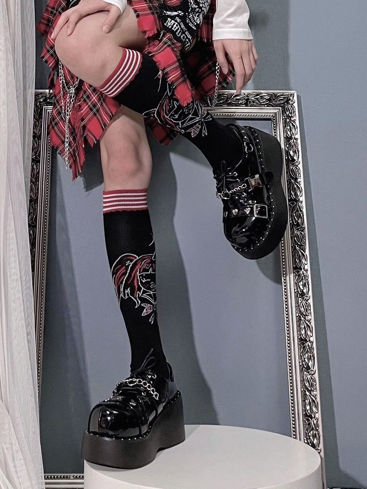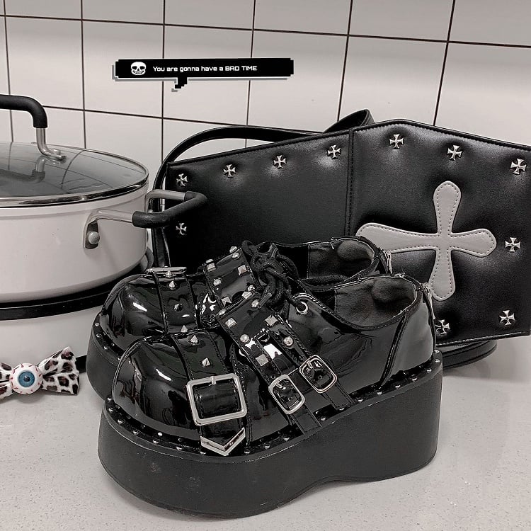 Devil's Trap Lace-up Closure Silver-tone Studs Polished Black Flatforms