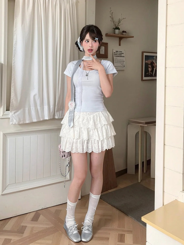 Dolphin-shaped Cutout Back Blue Scoop Neckline T-shirt