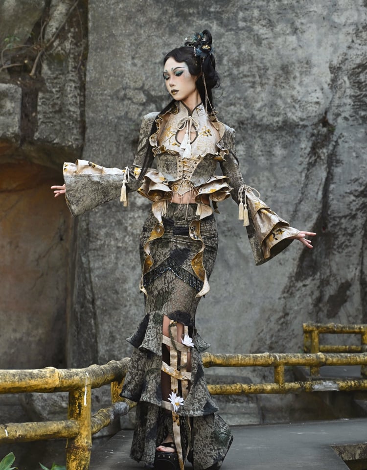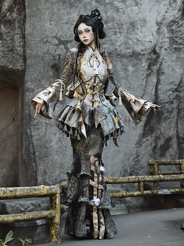 Elevate your wardrobe with this distinctive cropped jacket, masterfully crafted to combine luxurious jacquard and green snake-skin fabrics for a eye-catching look. The front features a lace-up closure design, complemented by a ruffles under bust neckline.