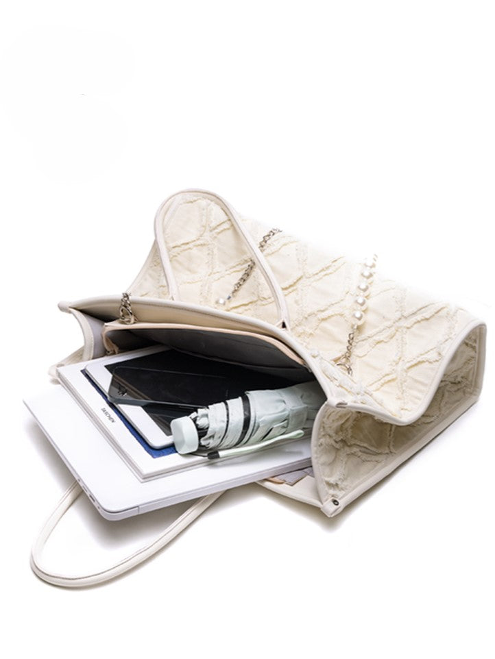 Elegant blue quilted tote with pearl chain accent. Spacious and chic, perfect for office or daily outings.