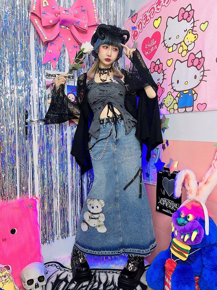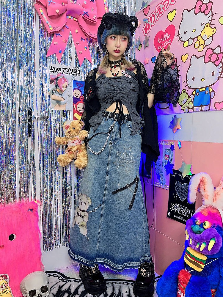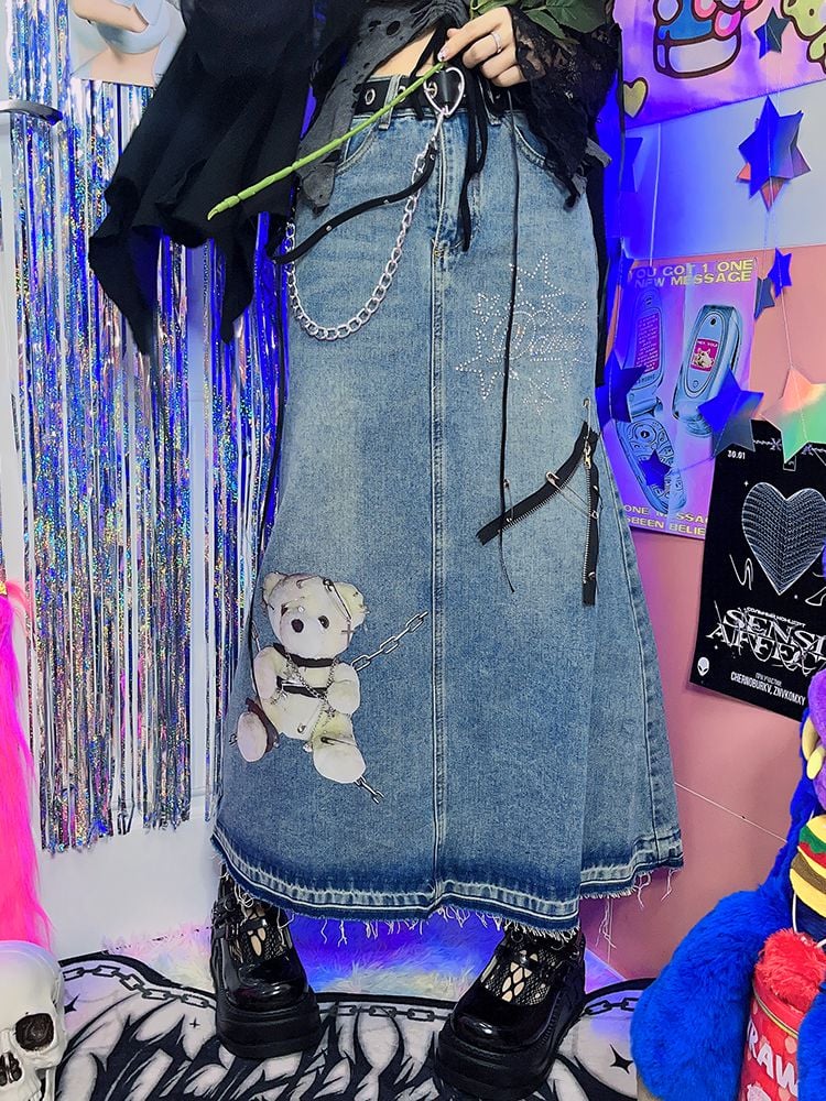 Faded Wash Little Bear Print Denim Skirt Pins Zip Decorated Raw Hem