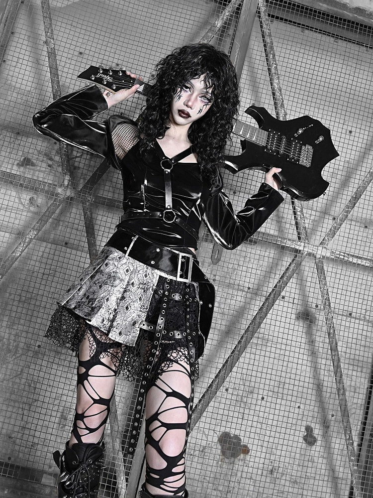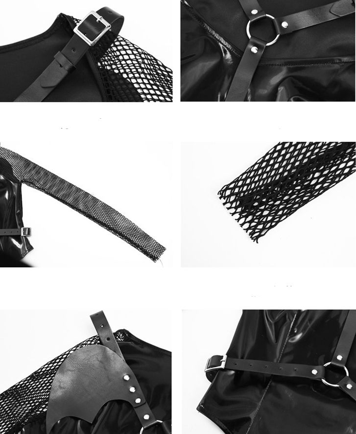 Fishnet Sleeves Black PU Top with Wings Design Straps Coachella Outfits
