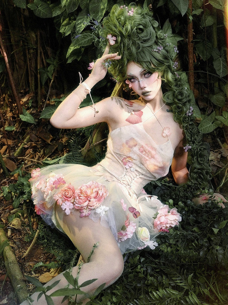 Featuring a double-layered semi-sheer cowl neckline adorned with delicate floral appliques, the self-tie halter neck design offers a customizable fit, while the adjustable lace-up at the waist ensures comfort and style. A convenient back zipper allows for easy wear, and the pointed hem is elegantly accented with four silk ribbon bows, adding a playful and charming finish.