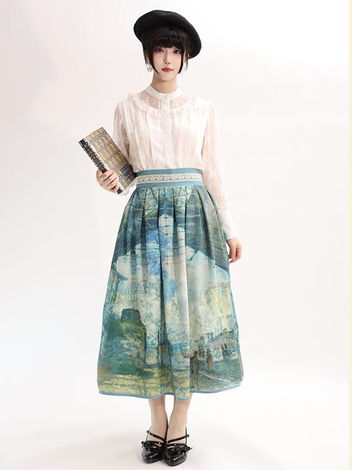 Gare Saint-Lazare Oil Painting Print Green High Waist Skirt Long/Short Version