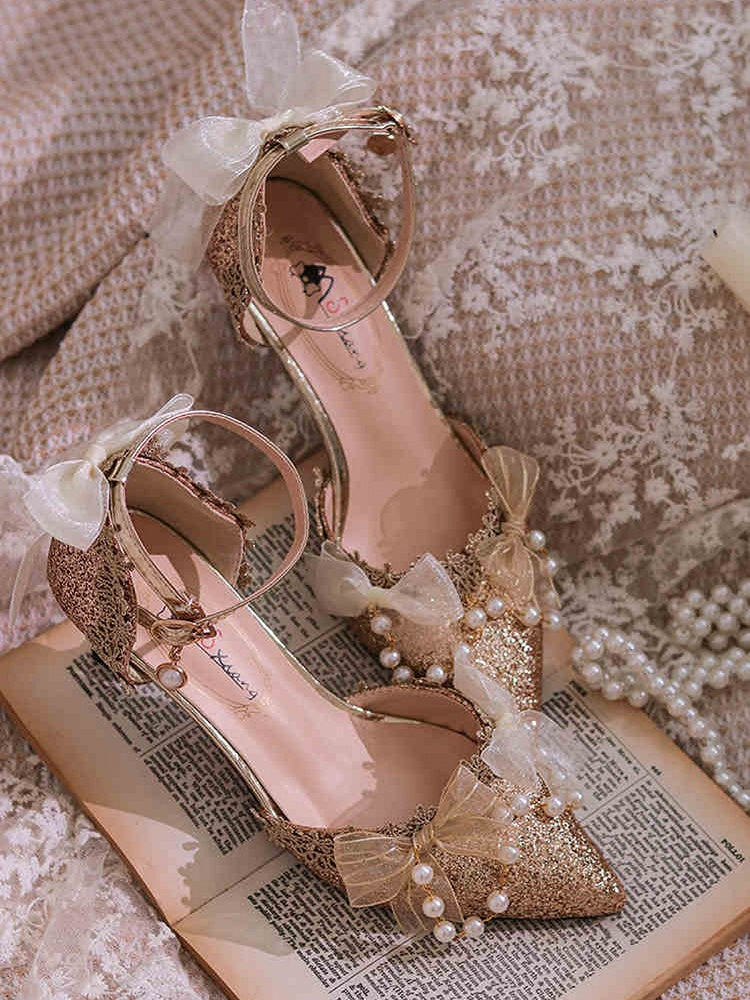 Gold Beaded Chain Pointed Toe Hime Lolita Middle Heels