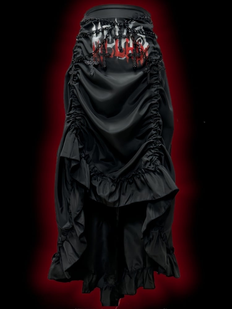 Embrace your dark side with this captivating piece, featuring intricate Gothic lettering prints and a unique ruched design that adds texture and depth. The high-waisted fit accentuates your silhouette, while the asymmetrical high-low hem provides an edgy twist. Perfect for those who love to blend punk vibes with a touch of vintage elegance. Complete the look with the included cross charms waist chain for an extra layer of mystique and style.