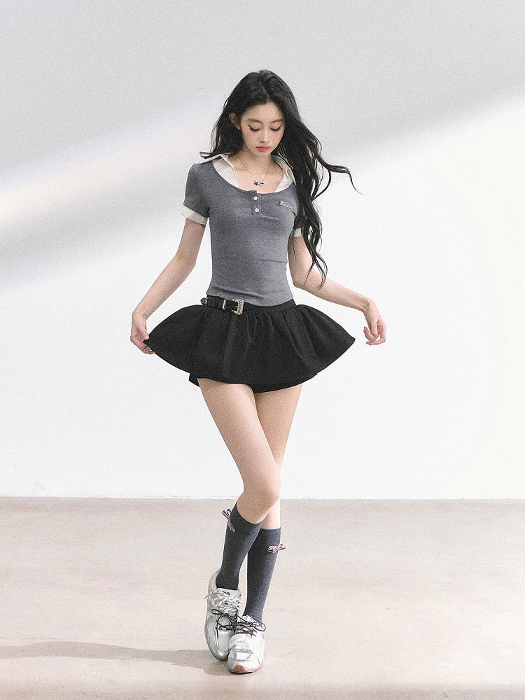 Gray and White Partial Floral Button Placket Faux Two-pieces T-shirt