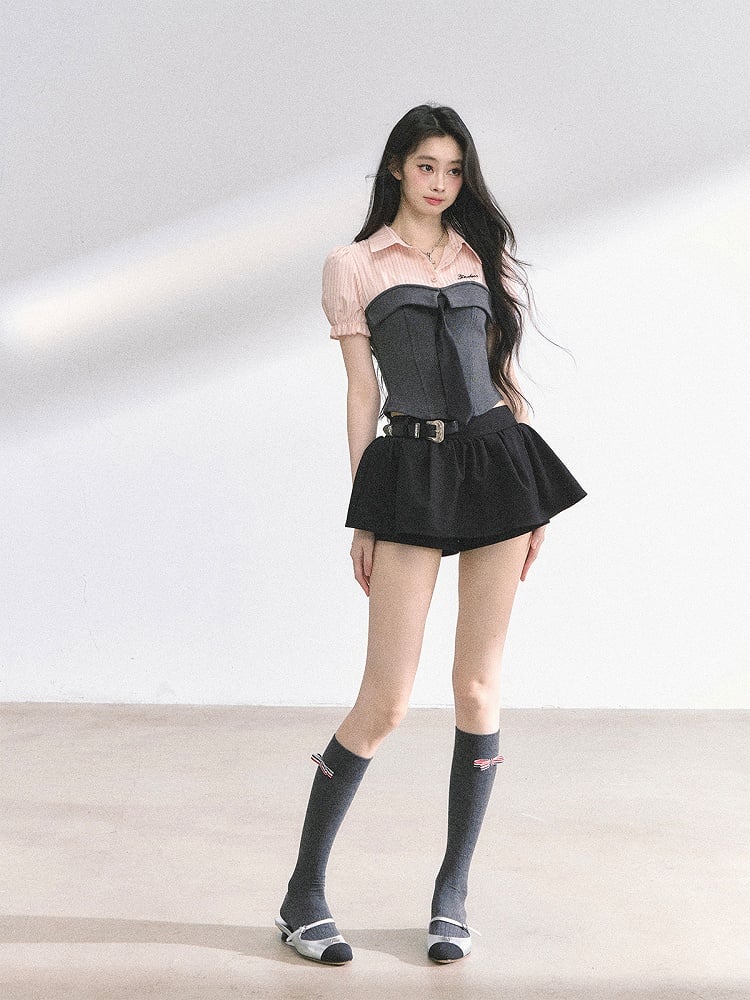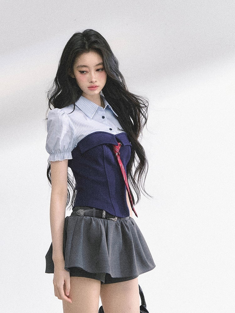 Gray & Pink / Navy Blue Striped T-shirt Faux Two-pieces with Free Tie