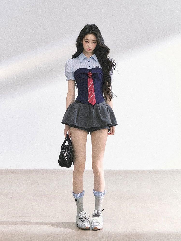 This unique design effortlessly blends the classic appeal of stripes with the contemporary layered look, creating a versatile piece that stands out. The attached necktie adds a touch of sophistication, making it perfect for both casual outings and more polished occasions.