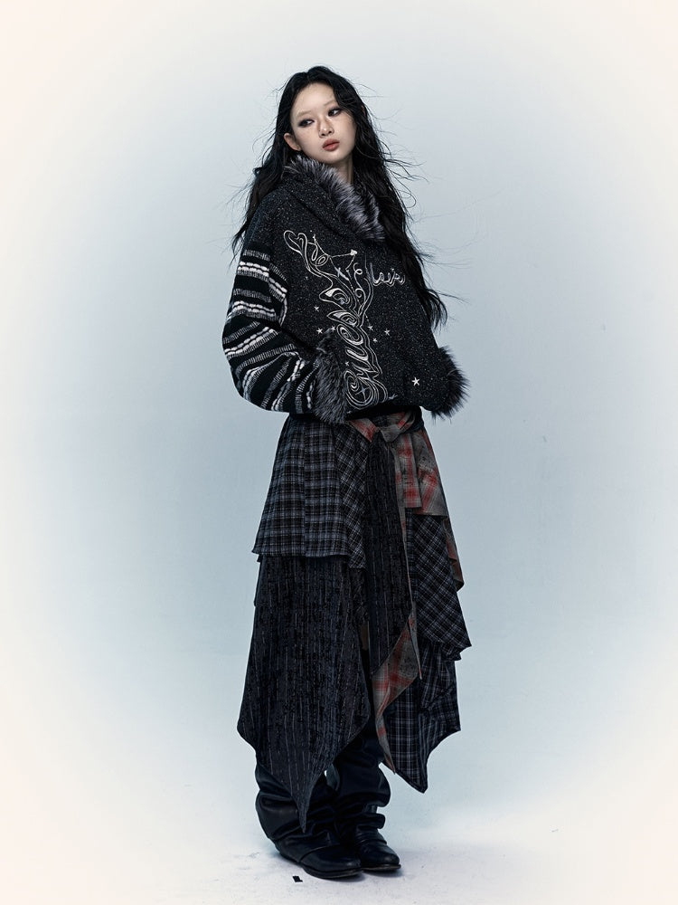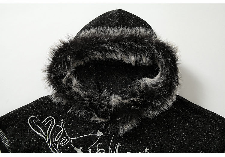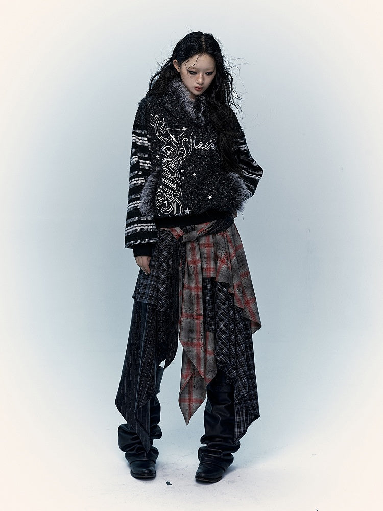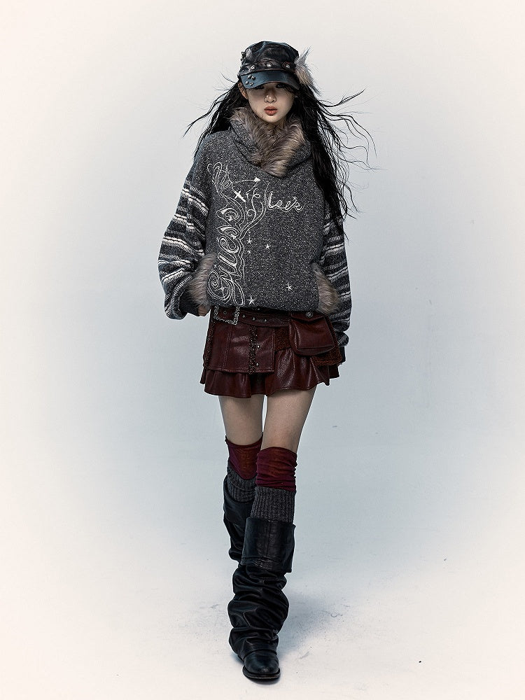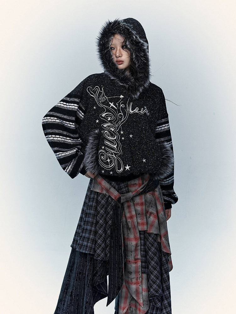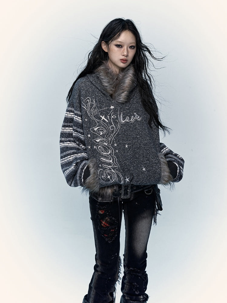 Gray&White/Black&White Plush Trim Striped Sleeves Hoodie