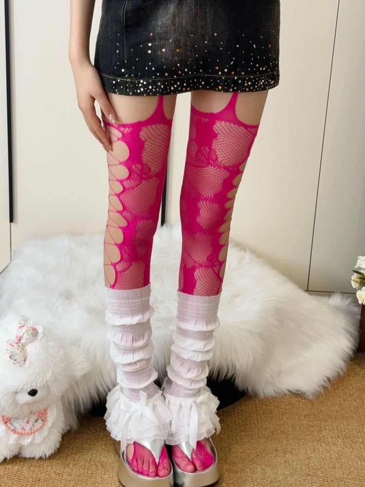 Gray/White/Dark Pink/Black/Red Cut-out Design Suspender Stockings
