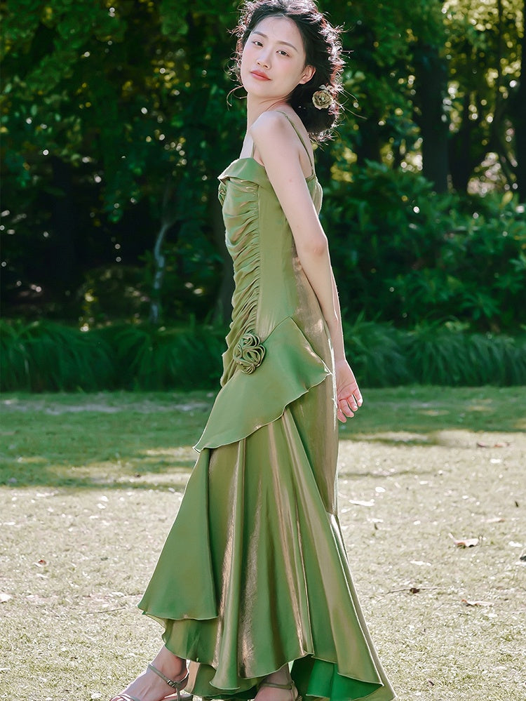 This dress features an irregular three-dimensional ruched design at the abdomen, perfectly concealing any tummy and creating a slimming effect. The hemline is crafted with a three-dimensional bias cut technique, adding a lively and charming sway to your movements. Adorned with floral decorations, this dress exudes a romantic and sweet allure.