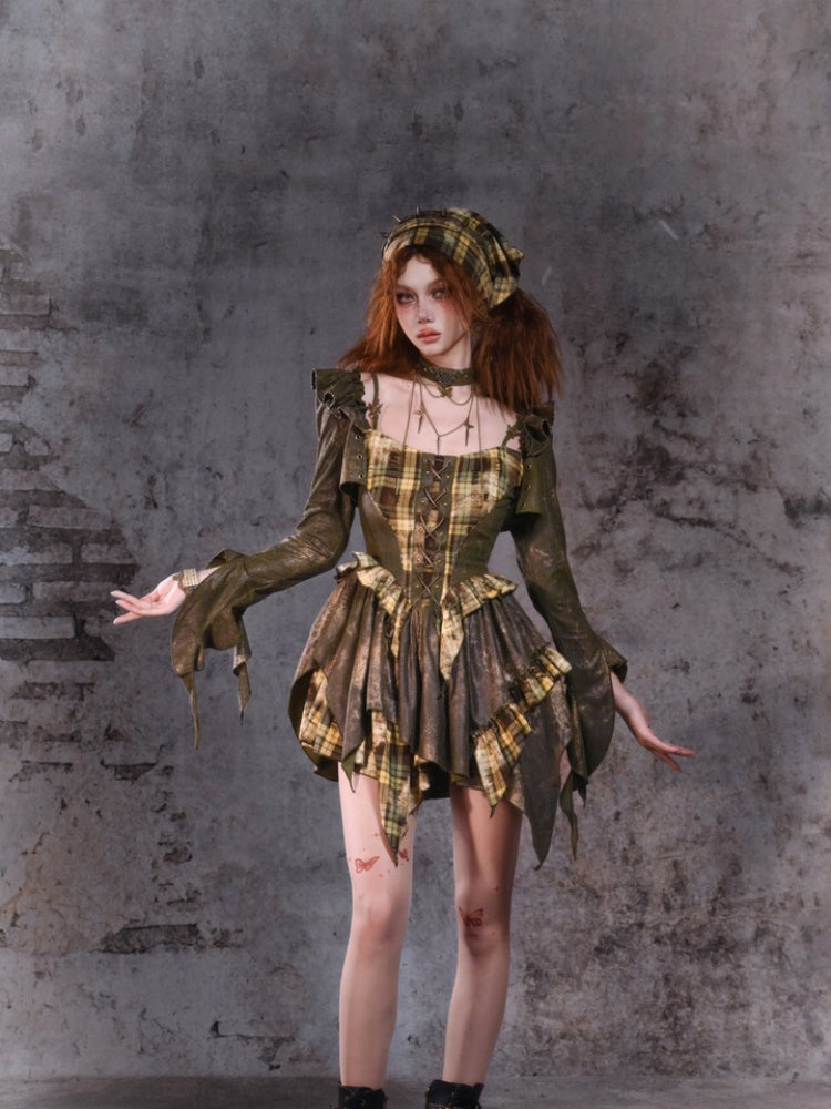 Green Plaid Strappy Dress with Asymmetrical Hem