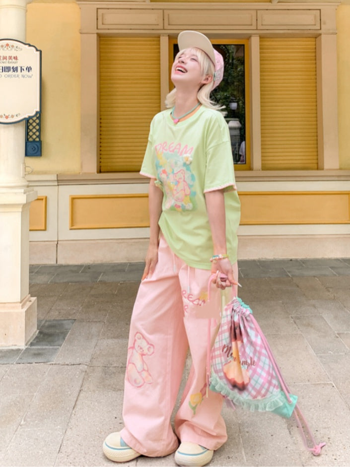 Green Round Neck Teddy Bear Print Knit Floral Accents Loose T-shirt