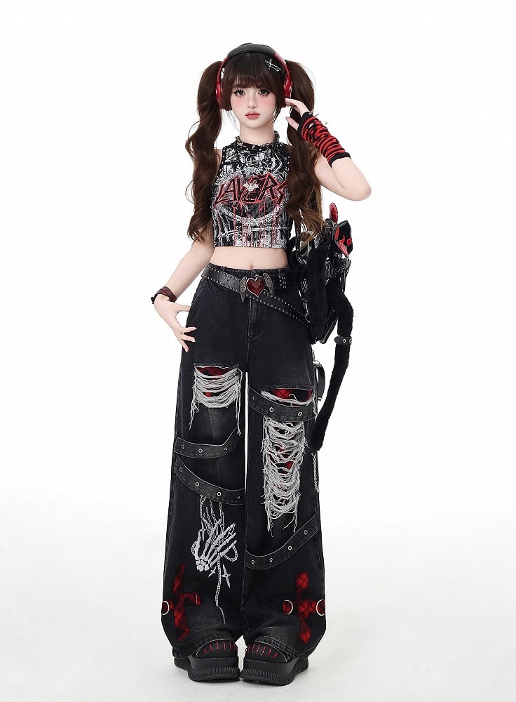 Grey/Red Plaid Faded Wash Distressed Holes Vintage Punk Wide-leg Jeans