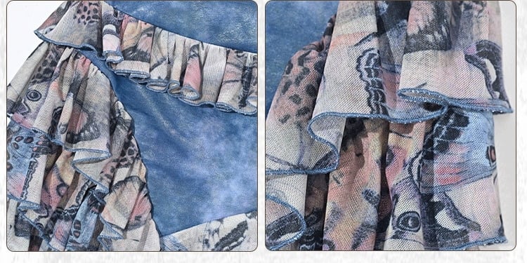 Grunge Punk Rock Fairy Style Blue Butterflies Print Tiered Ruffles Asymmetrical Hem Patchwork Skirt