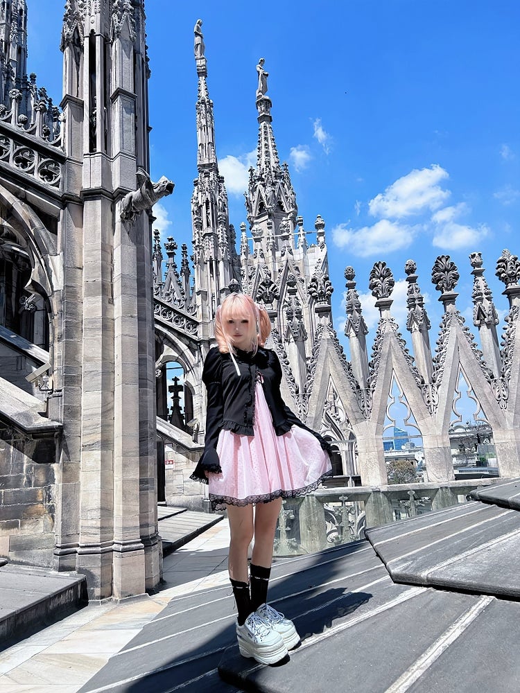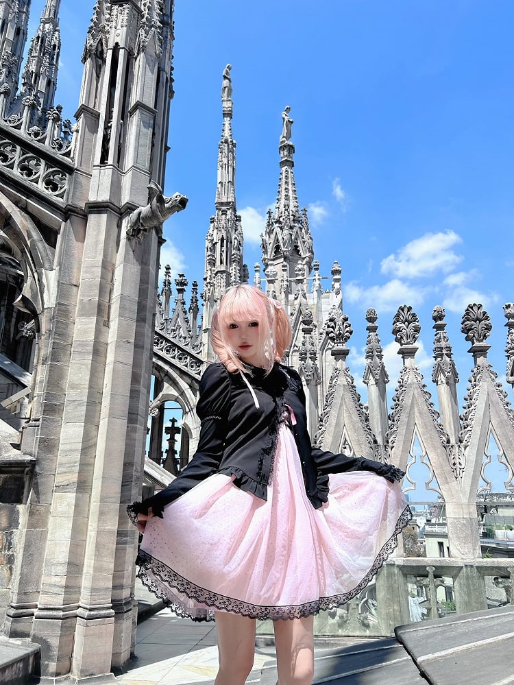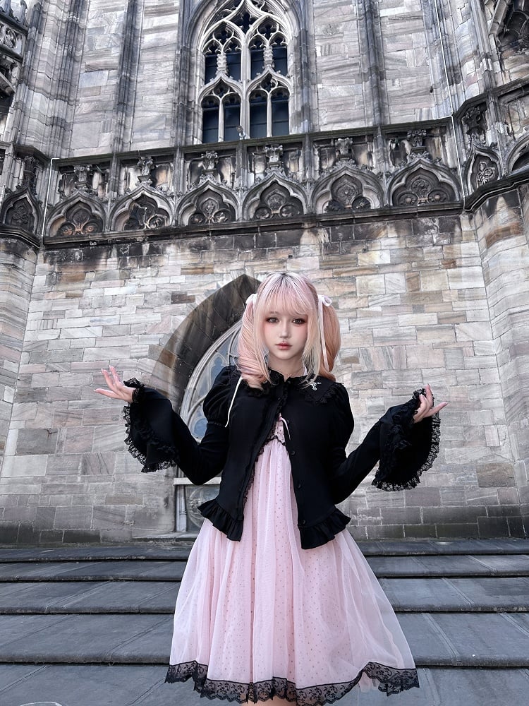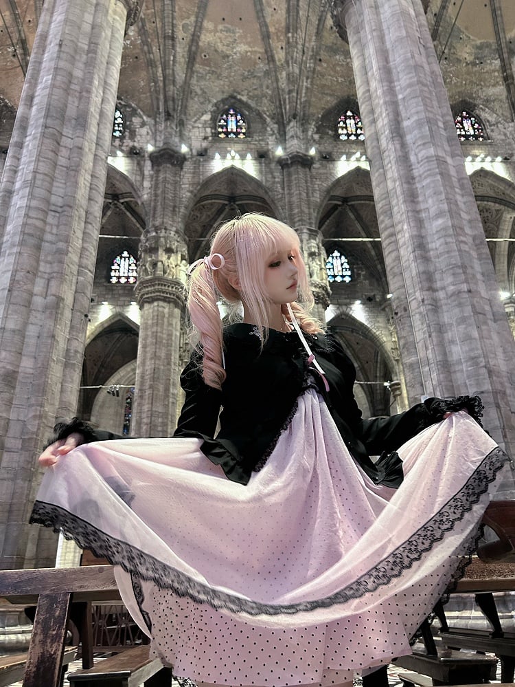 Gyaru Fashion Pink and Black Polka-dot Pattern Lace Trim Self-tie Halter Neck Slip Dress
