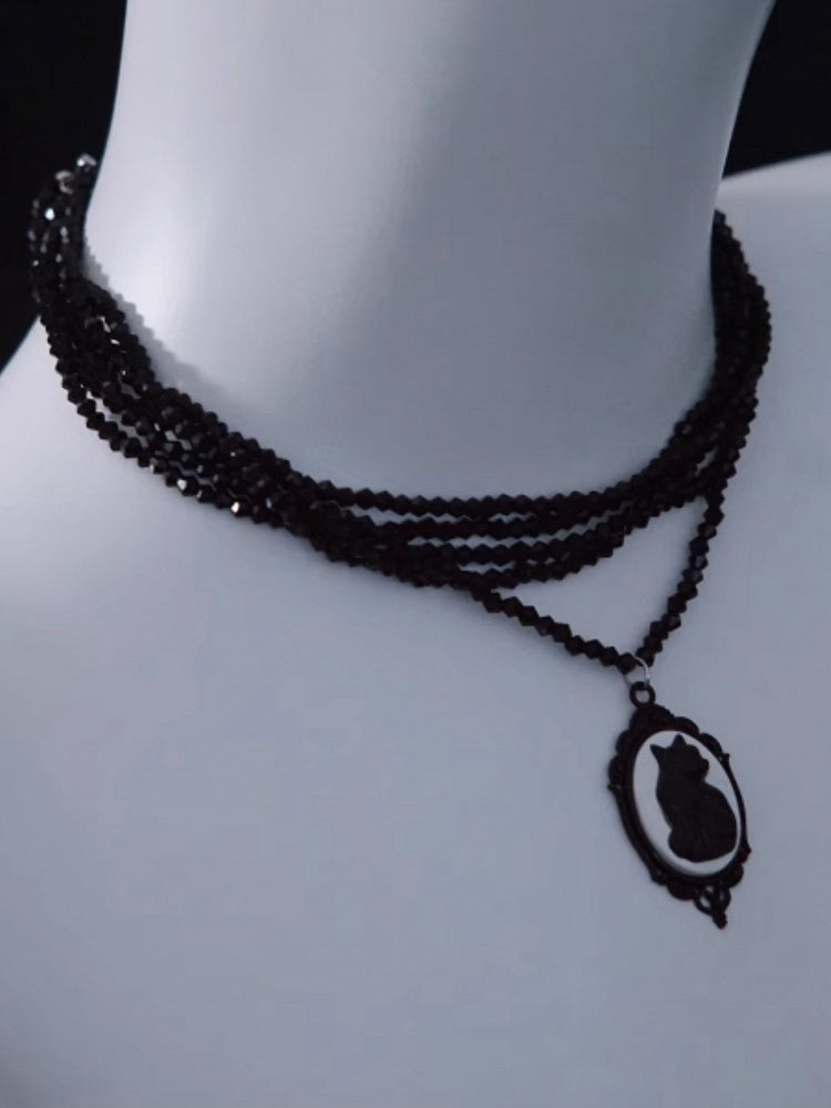 Embrace a touch of nostalgic elegance with our Vintage Black Cat Pendant Necklace. This exquisite piece features a charming black cat pendant that exudes a whimsical yet sophisticated vibe. The necklace is designed with multiple layers of delicate beaded chains, adding depth and a hint of sparkle to your ensemble. Perfect for pairing with your favorite sweater.
