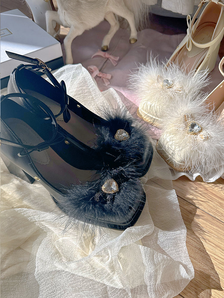 Heart-shaped Rhinestone Black High Block Heel Mary Janes