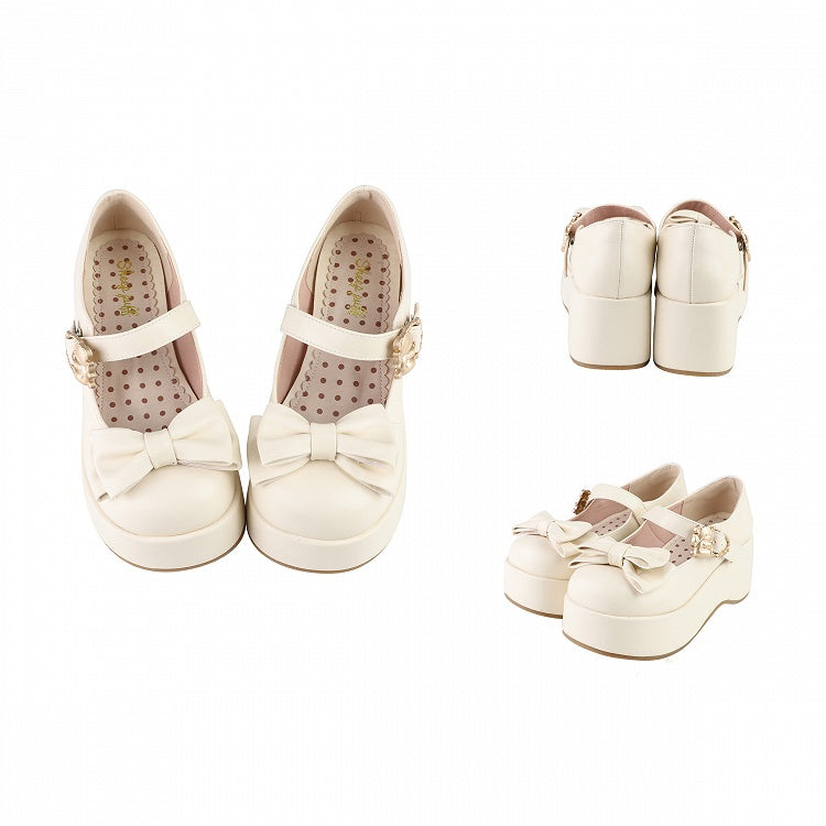 Hugging Bear Heart Buckle Beige Bow at Top Platform Mary Janes with Velcro Strap