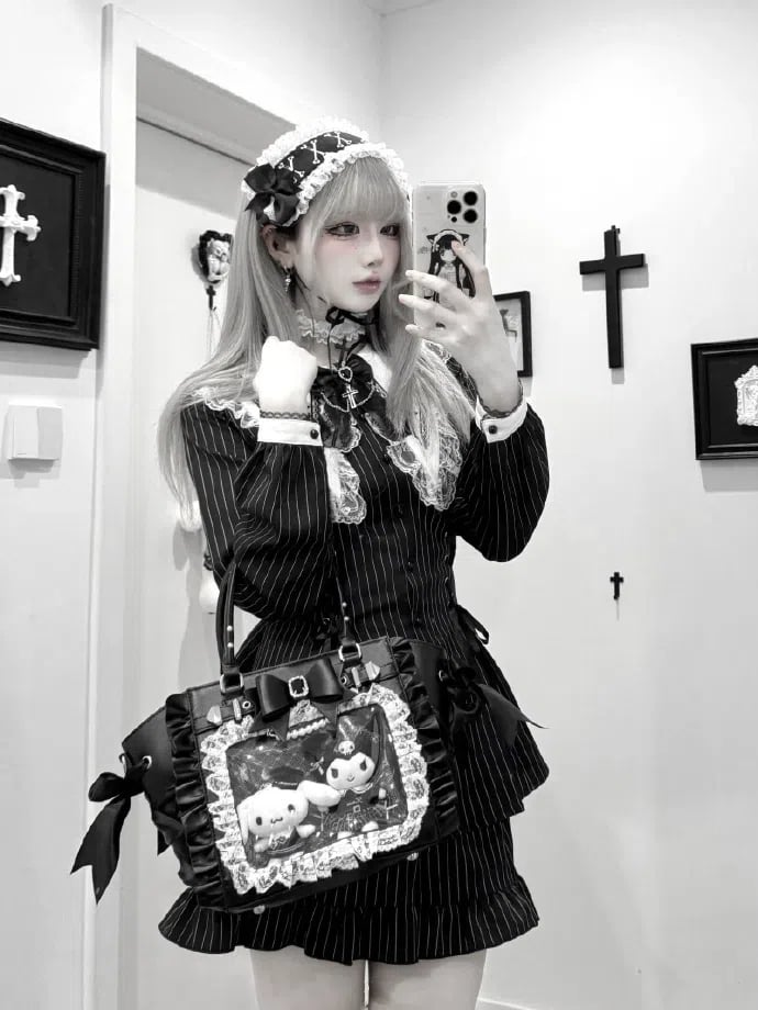 Jirai Kei Black Lace Trim Ita Tote – Large Capacity, Top Handle