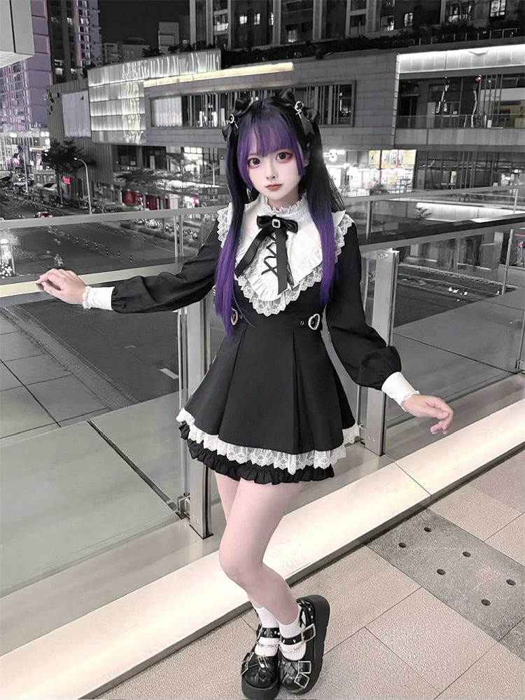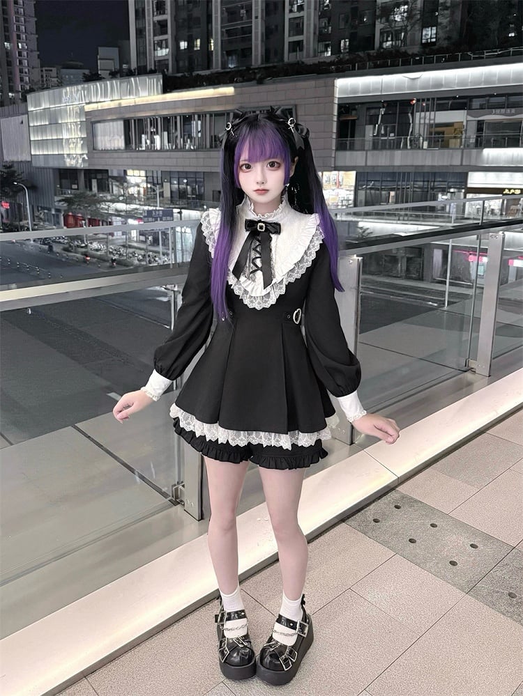 Elevate your wardrobe with this sophisticated Jirai Kei ensemble, featuring a black ruffle neckline long-sleeve top adorned with delicate white lace trim for an elegant contrast. The top exudes a refined charm, with heart-shaped buckles accentuating the waist for a touch of romantic flair. Paired with matching shorts, this set effortlessly combines style and comfort, making it a versatile choice for any occasion.