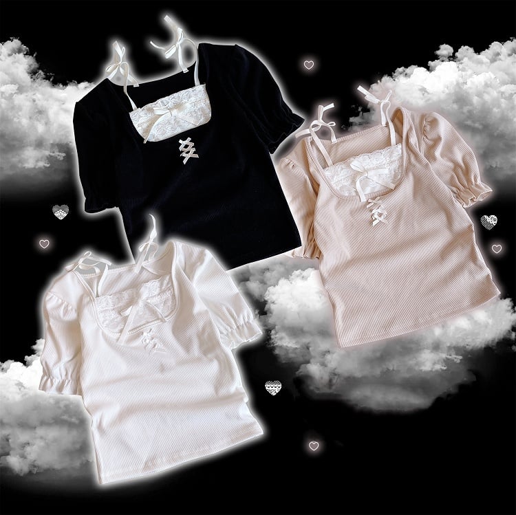 Jirai Kei Pink/White/Black Lace Trim Bowknot Details Puff Sleeves Blouse