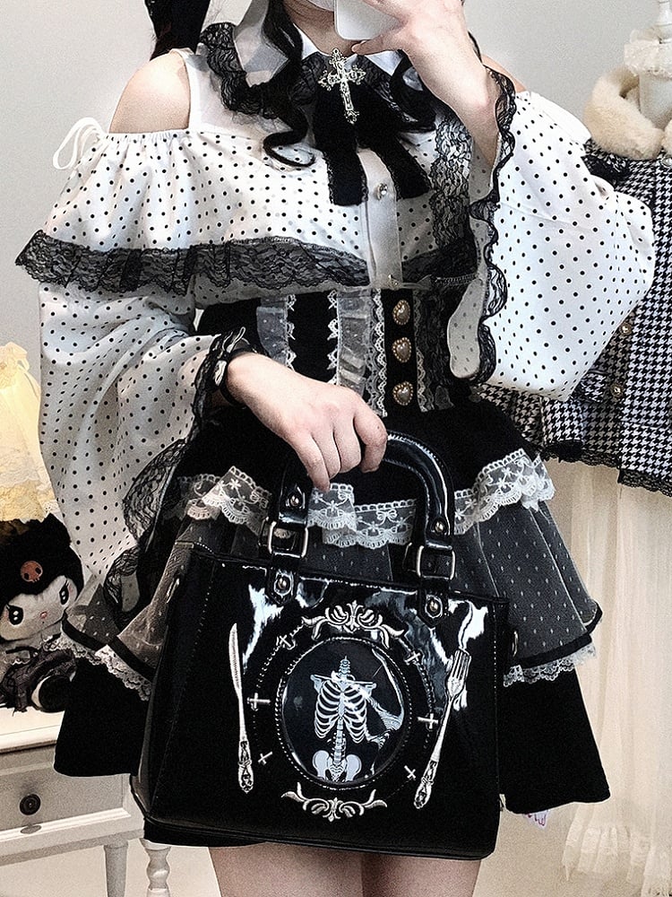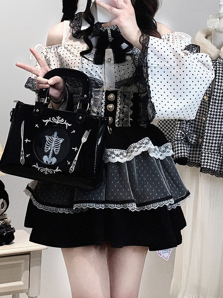 Embrace the playful elegance of Jirai Kei fashion with this stunning Polka-Dot Bell Sleeve Blouse. Featuring a chic cutout shoulder design with a delicate drawstring, this blouse perfectly balances bold style with feminine charm. The heart-shaped rhinestone buttons add a touch of sparkle, while the contrasting black lace trim provides a sophisticated edge.