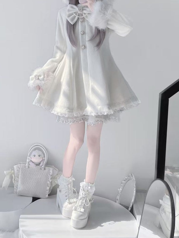 Jirai Kei White Wool Blend Coat with Detachable Bunny Hood | A-Line Winter Style