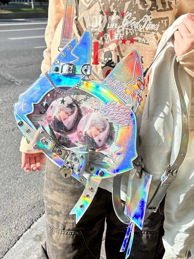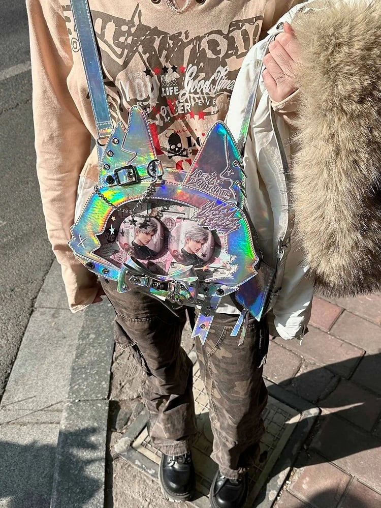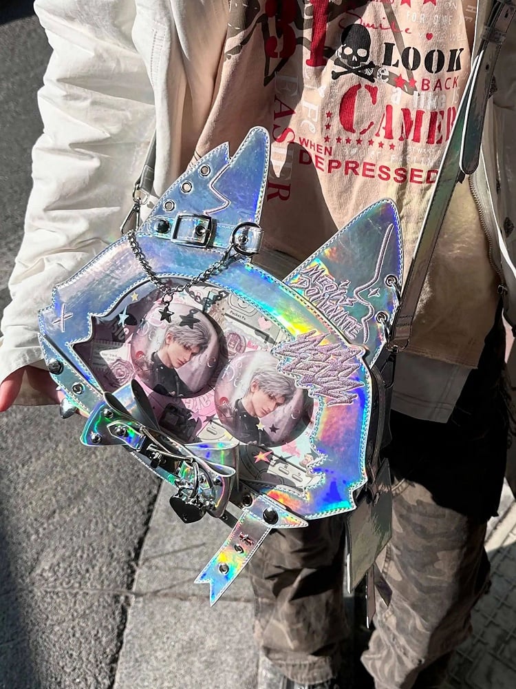 Kitty Ear Design Bowknot Studs Detail Holographic Color PU Tote Ita Bag with Free Card Holder